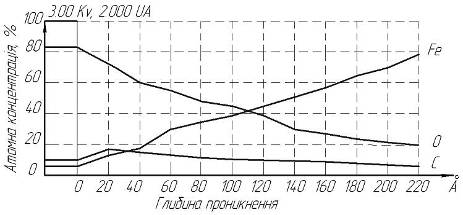 Встановлено (рис. 5), що на поверхні матеріалу спостерігається збільшення концентрації вуглецю після механічної обробки з МОТЗ, у складі якого є полімер і практично відсутні сигнали кисню і заліза. Відсутність на обробленій поверхні кисню говорить про те, що поверхня вільна від окісних плівок у зв'язку з тим, що водень і вуглеводневі з'єднання «зв'язують» кисень, тобто відновлює поверхню.