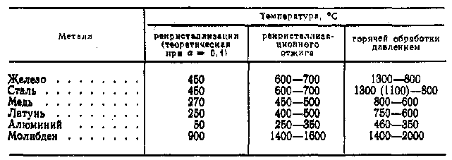 Для отжига наклепанного материала в производственных условиях применяют более высокие температуры, чем минимальная температура рекристаллизации, для обеспечения большей скорости рекристаллизационных процессов. В табл.1 приведены теоретические температуры рекристаллизации, температуры, при которых в производственных условиях осуществляют рекристаллизационный отжиг, а также температуры горячей обработки давлением.