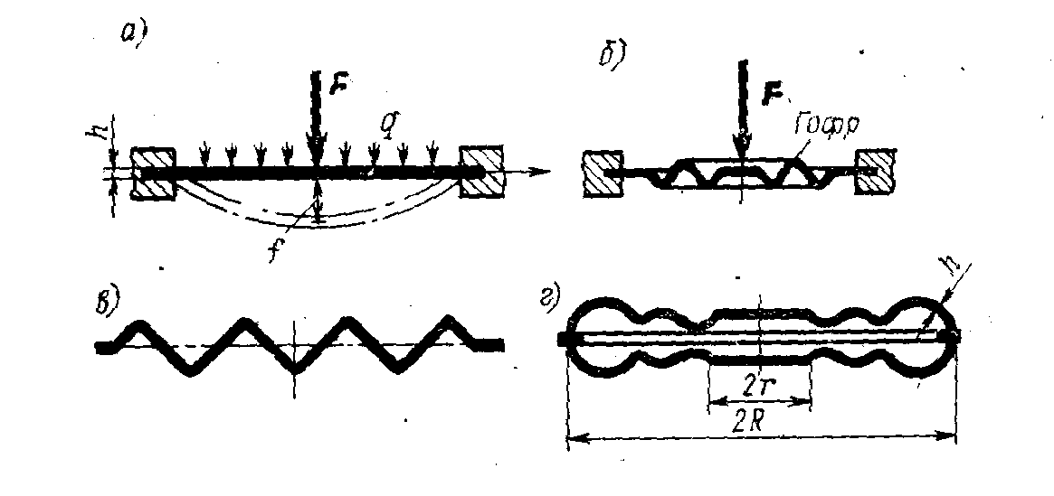 Под действием газа, жидкости или сосредоточенной силы (рис. 4, а) мембрана прогибается и в ней возникают деформации изгиба и растяжения. Для уменьшения растягивающих напряжений мембраны выполняют гофрированными. Плоские мембраны имеют большую жесткость и очень малый прогиб. В гофрированных мембранах концентричные волнообразные складки (гофры) могут быть выполнены различного профиля (рис. 4, б, в)–синусоидального, пилообразного, трапецеидального. Эти мембраны отличаются большей надежностью и чувствительностью, их конструкция допускает значительные деформации. Упругая характеристика гофрированной мембраны может быть линейной, затухающей и возрастающей, ее получают путем подбора формы, глубины и числа гофр, материала, толщины и диаметра мембраны.