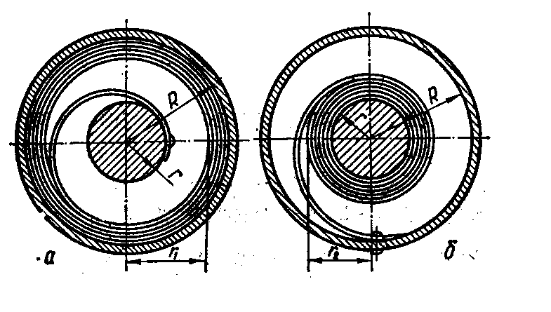 При заданных размерах барабана и поперечного сечения пружины пружинный двигатель имеет наибольшее число оборотов, если внутренний радиус r>1> в спущенном состоянии (рис. 2, а) равен наружному радиусу r>2> в заведенном состоянии (см. рис. 2, б). В качестве материала используют ленты из сталей У8А, 70С2ХА, бронзы БрОФ 6,5-0,15.