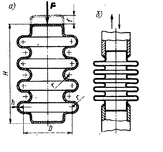Сильфонами называются тонкостенные цилиндрические сосуды, стенки которых имеют волнообразные складки (гофры) (рис. 5). Они применяются для измерения давления, герметизации подвижных соединений, в качестве сосудов переменной емкости (рис. 5, а), упругих соединений трубопроводов (рис. 5, б). Под действием сил F, приложенных к крайним сечениям внутреннего или внешнего давления, стенки сильфона деформируются и изменяется его длина.