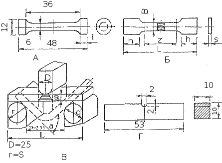 рис 1. Варианты образцов для определения механических свойств (размеры в мм): А-Б - на растяжение наплавленного металла (А) и сварного соединения (Б); В - на изгиб; Г - на ударную вязкость.