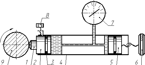 Процесс алмазного выглаживания кинематически аналогичен точению, только вместо резца применяется алмазный выглаживатель, который, пластически деформируя поверхностный слой, выравнивает и упрочняет его. Классическое устройство для выглаживания (см. рис. 1.16.) содержит корпус 4 из конструкционной стали, в который вставлены два поршня 2 и 5 с уплотнительными кольцами 3. Поршень 2 связан непосредственно с инструментом 1, рабочая поверхность которого изготовлена из алмаза. Положение поршня 5 фиксируется рукояткой 6. Фиксатор 8 ограничивает ход поршня 2. Манометр 7 контролирует давление рабочей среды.