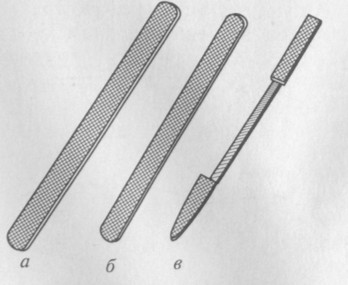 Напильники. При изготовлении обуви применяют напильники плоские для спиливания выступающих частей шпилек с поверхности подошвы и набойки и треугольные для заточки инструмента.