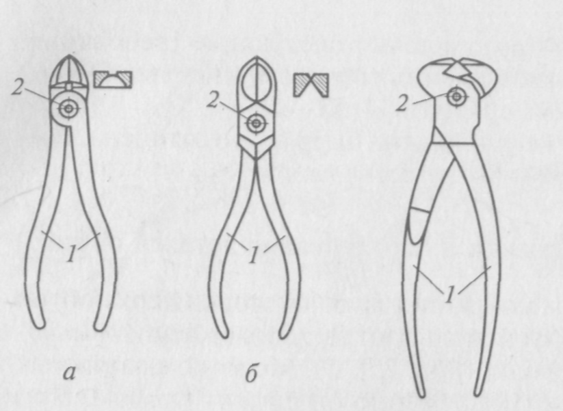 Рис. 2.10. Инструменты для удаления металлических крепителей: а, б — кусачки боковые; в — кусачки-острогубцы; г — плоскогубцы; д — хозяйственные клещи; — половинки клещей; 2 — ось