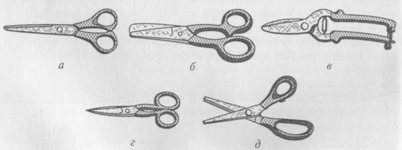 Для предотвращения порезов и царапин заготовки верха обуви нож имеет передвижной упор — предохранительную пластинку, прикрепленную винтом. Меняя положение пластинки, можно регулировать глубину резания. Ножом (рис. 2.2, в) прошву срезают заподлицо с поверхностью голенищ. Нерабочая часть ножа закреплена в деревянной ручке. Ножницы. Для резки кож и других материалов используют ножницы универсальные (рис. 2.3, а), закройные для кож верха обуви (рис. 2.3, б, в), с закругленными концами (рис. 2.3, г), для обрезания ниток (рис. 2.3, д).