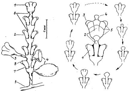 I — нормальная гидротека сформировавшегося гидранта; 2 — ствол побега; 3 — формирующийся гидрант; 4 — верхушка роста на ранней стадии морфогенеза; 5—последовательные характерные стадии развития верхушки