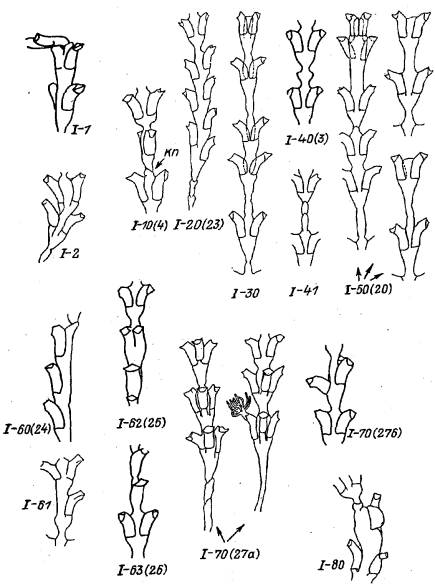 Рис. 3. Отклонения в морфогенезе ствола побега Dynamena pumUa без остановки его дальнейшего роста (группа I)