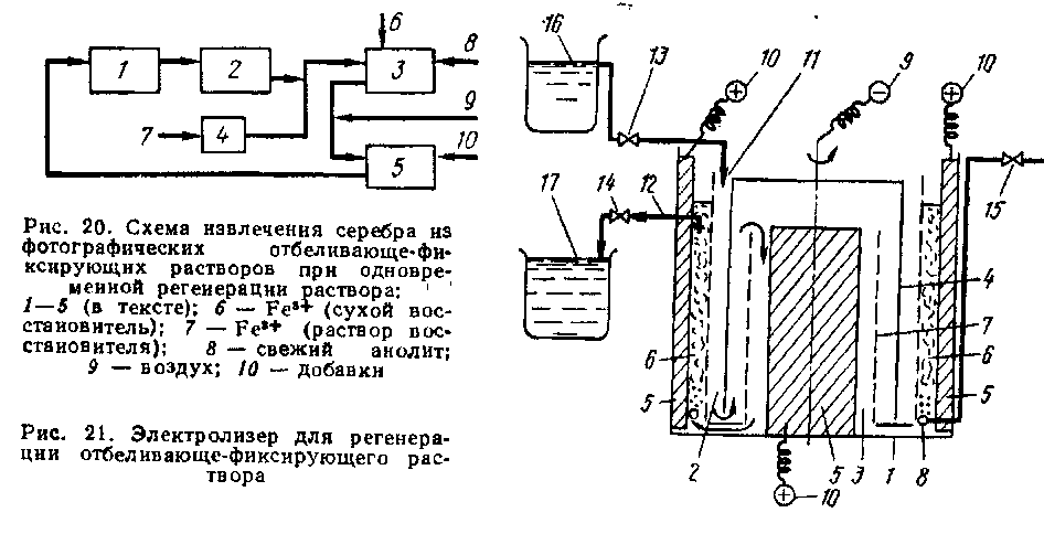 Отработанный обесцвечивающе-фиксирующий раствор из резервуара 16 через вход И поступает в катодное отделение 2. Серебро из комплексного соединения, содержащегося в этом растворе, осаждается на катоде и таким образом выделяется из раствора. Затем раствор через диафрагму 7 переводят в анодное отделение 3. Там раствор, взаимодействуя с кислородсодержащим газом, окисляется и регенерируется. Регенерированный раствор через выход 12 выводят в емкость 17; процесс регенерации заканчивается.