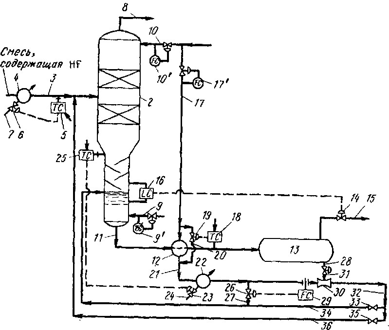 Линия 3 связывает колонну 2 с реактором алкилирования (на схеме не показан), конструкция и способ работы которого являются общеизвестными. По линии 3 в колонну 2 подается смесь, состоящая из HF, КРМ, воды и изобутана. Содержание воды в исходной смеси очень мало — обычно менее 3 %, поскольку используемые в качестве сырья олефин и изобутан подвергаются предварительной осушке. Для контроля температуры смеси желательно в линии 3 иметь теплообменник 4 и регулятор температуры 5. Последний управляет имеющимся в линии 3 клапаном о, открывая или закрывая его в зависимости от температуры подаваемой смеси.