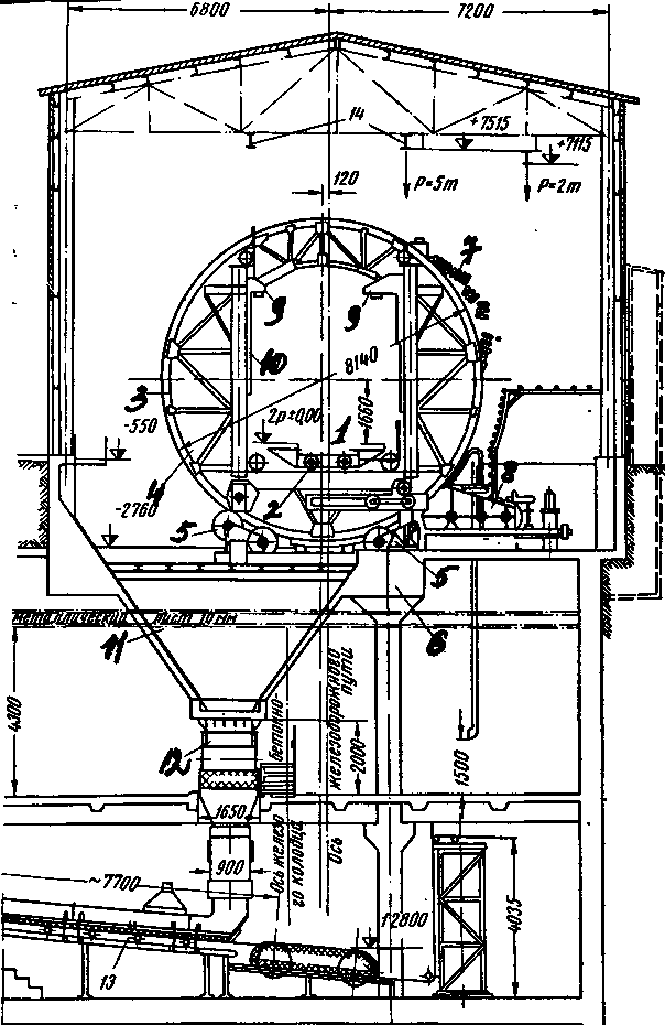 Платформа, на которой стоит вагон, передвигается на катках к нижней стороне ротора до тех пор, пока вагон не ляжет боковой поверхностью кузова на боковую поверхность ротора, облицованную деревянными брусьями 10, названными привалочными. Вагон вместе с ротором поворачивается на 165—175°' и уголь высыпается из вагона в два бункера 11 общей емкостью около 180 т. Затем ротор получает обратное вращение, вагон приходит в исходное положение.