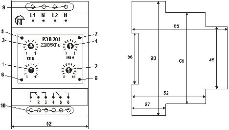 Электронное двухканальное реле времени с задержкой на включение РЭВ-201 (рис.9) предназначено для коммутации электрических цепей переменного тока 220В/50 Гц и постоянного тока 24-100 В с регулируемыми задержками времени: канал 1 от 0 до 10 сек, канал 2 – от 0 до 10 мин. Каждый канал является самостоятельным реле времени. Выдержка времени каждого канала начинает отсчитываться от момента подачи питания на канал. Реле РЭВ-201 позволяет обеспечить два режима работы: