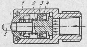 Аналогичное по принципу действия устройство, называемое индикатором давления, применяют для подачи сигнала о наличии давления на определенных участках пневмосистемы. Этот индикатор представляет собой миниатюрный силовой цилиндр одностороннего действия (рис.8). В корпусе 1 цилиндра перемещается поршенек 3, уплотняемый резиновой манжетой 4.