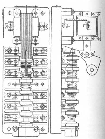 1,5, 9, 13 — неподвижные контакты; 12 — карболитовая пластина; 2, 4, 10, 11 — подвижные контакты; 3 — несущий мостик; 8, 14 — пружины, воздействующие на мостик к карболитовый шток 7.
