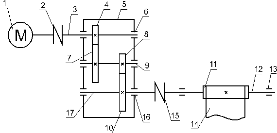Проектируемый редуктор служит для передачи вращения и изменяющегося крутящего момента от электродвигателя к исполнительному механизму – приводному барабану ленточного конвейера. Проследим передачу момента. От электродвигателя 1 посредством муфты 2 крутящий момент передается на быстроходный вал 3, установленный в корпусе 5 на подшипниках 6. Быстроходный вал имеет зубчатый венец 4 (шестерня), которая зацепляется с зубчатым колесом 7, установленным посредством шпоночного соединения с промежуточным валом 9, установленным также на подшипниках качения. На промежуточном валу имеется также зубчатый венец 8 (промежуточный вал может быть выполнен в виде вал-шестерни), которое зацепляется с зубчатым колесом 10, установленным посредством шпоночного соединения на тихоходном валу 17, установленном также в корпусе редуктора на подшипниках качения. Выходной конец тихоходного вала 17 посредством шпоночного соединения и муфты 15 соединен с приводным валом 12 барабана 11 ленточного конвейера с лентой 14.