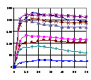 Изучена кинетика сорбции – десорбции ароматобразующих веществ на тонких пленках модификаторов пьезосенсоров. В оптимальных условиях при постоянных температуре и концентрации аналитов в равновесной газовой фазе построены выходные кривые сорбции ароматобразующих веществ на пленках модификаторов электродов пьезокварцевых резонаторов (рис. 2).