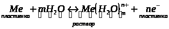 Для всех металлов характерно свойство в большей или меньшей степени растворяться в воде. При этом в воду переходят положительно заряженные ионы металла, в результате чего пластинка (из-за появления в ней избыточных электронов) заряжается отрицательно. Гидратированные катионы металла скапливаются возле поверхности пластинки на границе раздела двух фаз (металл-раствор). Возникает двойной электрический слой, характеризующийся некоторой разностью электростатических потенциалов. Как известно, энергию, которую необходимо затратить (положительный потенциал) или которую можно получить (отрицательный потенциал) при переносе единицы электричества из бесконечности в данную точку, называют электрическим потенциалом. Между пластинкой и раствором устанавливается окислительно-восстановительное равновесие: