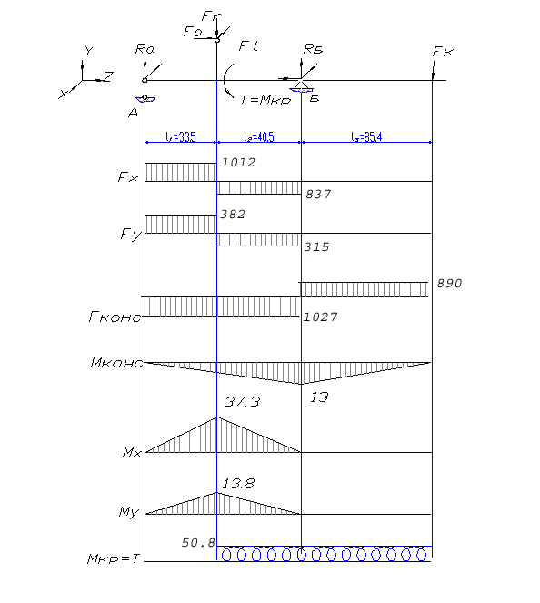 Ft=1848.3 Н; Fr=697.6 Н; Fa=507.7 Н; Т=50.8 Н·м