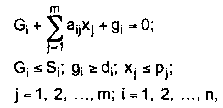 где G, _ количество 1-го вещества - сырья; т - число технологий; а,у - коэффициент эффективности переработки /-го продукта в у-й подсистеме; а# < 0, если i - сырье; ау > О, если / - продукт производства; а - характеризует матрицу преобразования вещества в результате реализации технологий; x>i>>}> - количество вещества, перерабатываемого ■ у-й подсистеме; д, - количество /-го вещества - продукта производства; S, - количество сырья; с/, - требуемое количество /-го сырья; р, - ограничение по мощности у-й подсистемы; п - число различных веществ в системе.