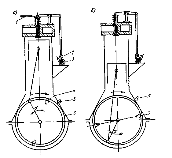 Определив угол β>1>, вал проворачивают снова до момента, когда ролик сможет проворачиваться или щуп не будет зажат, а стрелка индикатора прекратит движение. В этот момент кулачок (рис. 1, б) выйдет из-под ролика и клапан сядет на свое седло. В момент закрытия клапана кривошип перейдет н. м. т., угол запаздывания впуска γ>1> определится плоским углом или дугой окружности обода маховика между указателем 5 и меткой 7. Аналогично определяют углы опережения выпуска β>2> и запаздывания γ>2>.