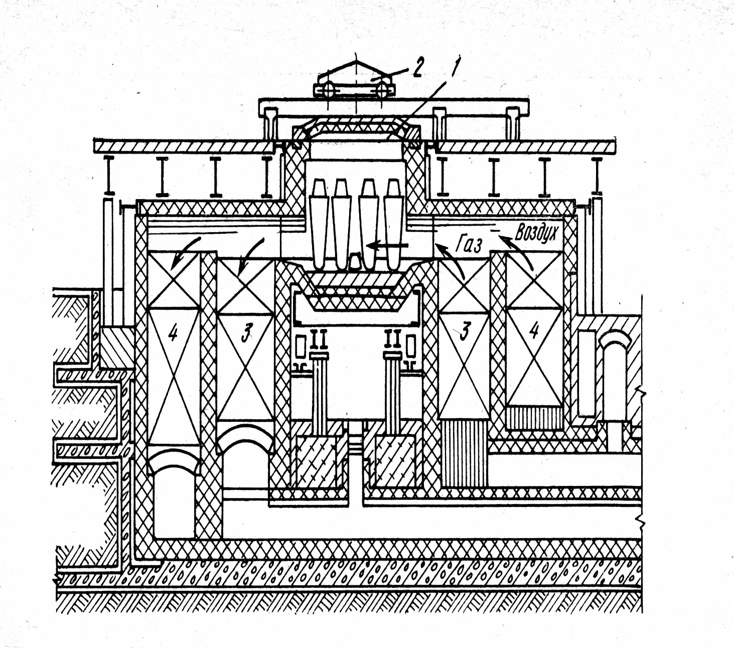 1-кришка; 2-механизм для переміщення кришки; 3-газовий регенератор;