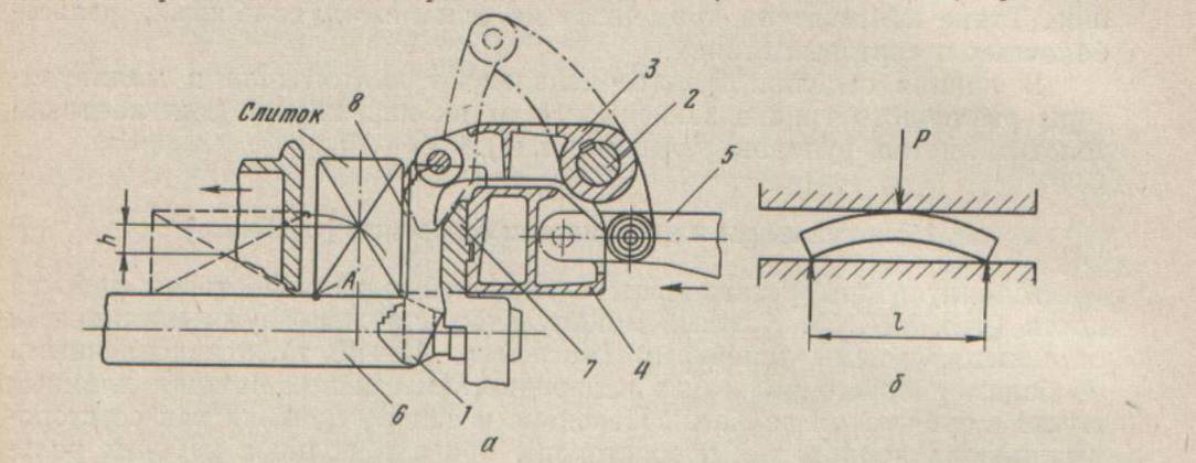 Схема кантувальника крюка і схема правки слябів лінійками маніпулятора (б)