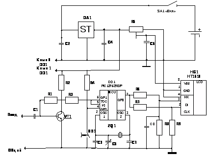 После включения питания микроконтроллер выполняет подпрограмму измерения частоты с временем счета 0,1 с. При кратковременном нажатии на кнопку SB1 значение частоты фиксируется и микроконтроллер измеряет отклонение частоты от зафиксированного значения с последующим отображением этого отклонения на табло индикатора HG1. Повторное кратковременное нажатие на кнопку SB1 возвращает устройство в исходное состояние. Для перехода в режим измерения частоты и её отклонения с временем счета 1с следует нажать на кнопку SB1 и удерживать её не менее 2с. Еще одно длительное нажатие на кнопку SB1 переводит устройство в режим счета импульсов. В этом режиме по коротким нажатиям на кнопку последовательно происходят запуск, остановками обнуление счетчика и индикатора времени измерения.