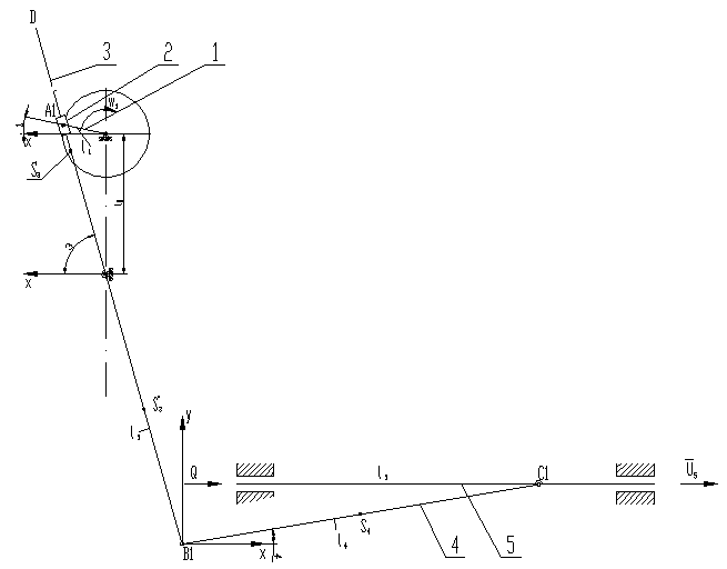 Для перемещения ползуна используется кулисный механизм с качающийся кулисой, состоящий из кривошипа 1, камня 2, шатуна 4 и ползуна 5.