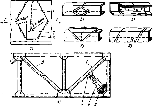 Рисунок 1. Схемы к ремонту металлоконструкций: а - ремонт элемента с трещиной; б, в, г - наложение соответственно ромбовидной, треугольной и коробчатой накладок; д - замена дефектного участка; е - правка и замена стержневых элементов с дефектами; 1 - трещина; 2 - отверстие - деконцентратор; 3 - накладка; 4 - подкладка; 5 - домкрат; 6 - брусья; I - элемент, подлежащий правке; II - элемент, подлежащий замене.