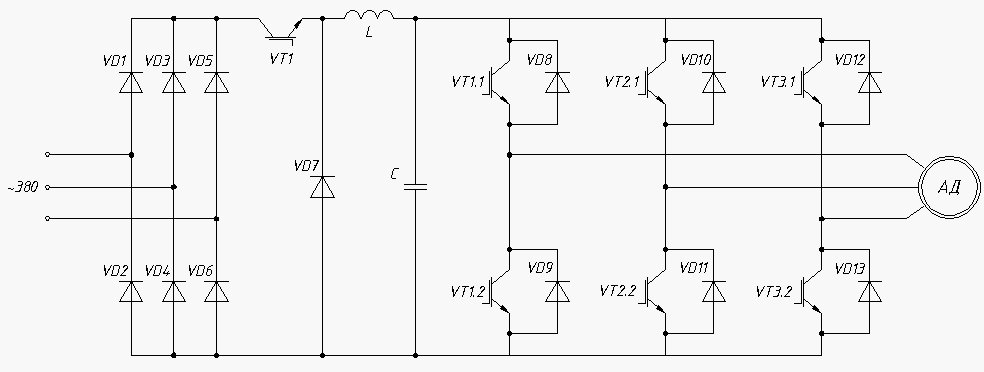 Трехфазное напряжение, подаваемое из сети, поступает на выпрямитель сформированный из диодов VD1 … VD6, в котором происходит выпрямление этого напряжения. За счет IGBT транзистора VT1 и диода VD7 имеется возможность ограничивать напряжение, подаваемое на автономный инвертор напряжения, собранный на IGBT транзисторах VT1.1 … VT3.2 и диодах VD8 … VD13.