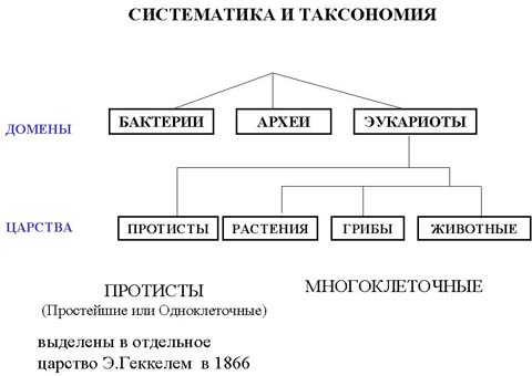 Все живые организмы подразделяются на три больших группы, называемые доменами: археи, бактерии и эукариоты. Домены подразделяются на царства. Раньше, весь живой мир делился на растения и животные, потом были добавлены протисты (простейшие, или одноклеточные) Геккелем в девятнадцатом веке. Потом были выделены в отдельное царство бактерии. Это царство впоследствии было разделено, как мы уже говорили, на эубактерий (собственно бактекрий) и архебактерий (архей). Грибы ранее относили к растениям, но сейчас их считают отдельным царством.