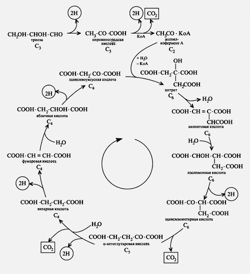 Ниже представлен цикл Кребса – основной энергетический цикл клеток. Этот цикл обеспечивает клетку энергией, в его ходе синтезируется АТФ.