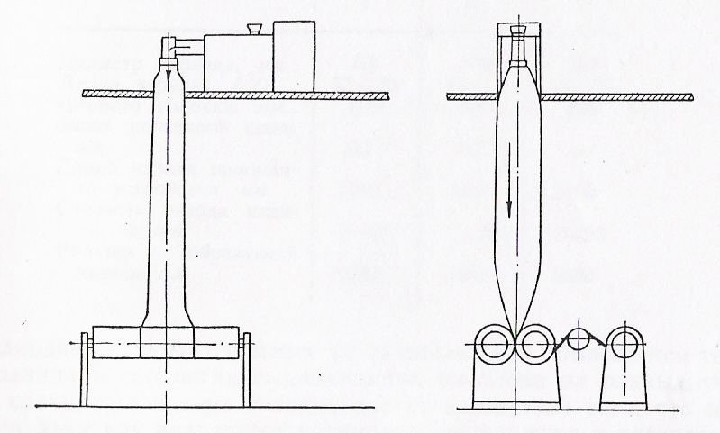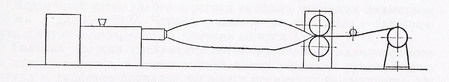 По первой схеме установки легче обслуживать агрегат, чем повторной, потому что червячный пресс и приемное устройство расположены на одном уровне. По этой схеме обеспечивается также получение толстых пленок; при приемке вниз толстостенный рукав обрывается под действием собственного веса. При горизонтальной приемке трудно получить пленку с небольшой разнотолщинностью, потому что в этом случае всегда велика разница между температурой воздуха, окружающего нижнюю и верхнюю поверхности рукава. Таким образом, чаще всего пользуются первой схемой.