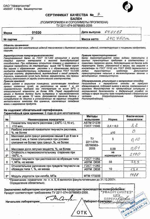 паспорт качества на Полипропилен 01030 (бален) производства Уфаоргсинтез, ОАО от 25.06.08