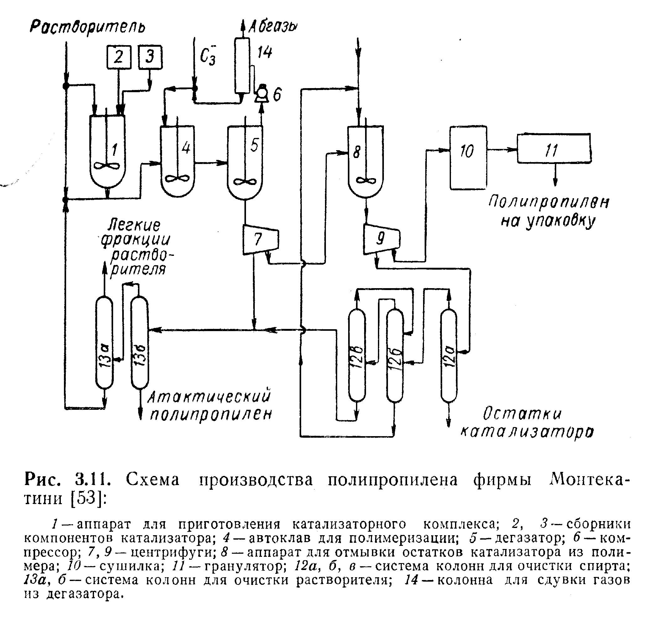 В полимеризационный автоклав 4 , снабженный охлаждающей рубашкой , в один прием загружают оба компонента катализатора и мономер. Полимеризацию ведут при температуре =80° С и давлении до 30 ат в определенном количестве растворителя (гептана). Как только скорость полимеризации падает (вследствие конверсии мономера) ниже некоторого предела, часть реакционной массы (30—50% объема автоклава) переводят в аппарат для дегазации 5. В автоклав 4 из аппарата 1 подают нужное количество дисперсии катализатора в гептане, а также свежий мономер с таким расчетом, чтобы уровень жидкости в автоклаве был таким же, как вначале. При крупнотоннажном производстве параллельно устанавливают 6—10 полимеризационных автоклавов, рабочие циклы (загрузка и разгрузка) которых соответствующим образом смещены друг относительно друга. Все операции на данной стадии процесса выполняются автоматически по заданной программе. На следующей стадии полимер отделяют от растворителя и содержащихся в нем атактических фракций. Затем производят экстракцию остатков катализатора спиртами, а также промывку или отпарку полимера. После сушки порошковый полипропилен подвергают грануляции на двухчервячной экструзионной машине с вакуумотсосом.