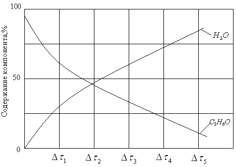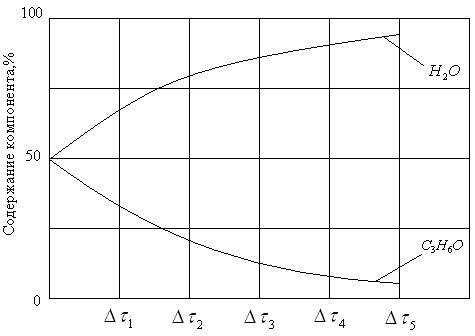 По мере кипения состав бинарной смеси во времени изменяется. Это связано с тем, что летучий компонент (ацетон), имея большее парциальное давление, в большей мере поступает в паровую фазу, а поэтому его содержание в жидкой фазе уменьшается.