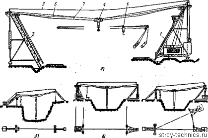Кабельный кран (рис. 3, а) состоит из двух стационарных или передвижных опор, между которыми подвешен несущий стальной канат; по канату перемещается тележка с блоками подъемного механизма и крюковым или грейферным захватом. Тележка перемещается при помощи связанного с ней тягового каната, образующего замкнутую петлю. Для подъема груза используется подъемный канат, один конец которого обычно закрепляется на одной из отгор крана, а второй — в барабане лебедки, установленной на противолежащей опоре. В пролете подъемный канат опирается на поддержки.