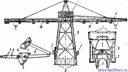 1 — машинное помещение; 2 — кабины управления; 3 — грузовая тележка; 4 — подъемная лебедка; 5 — подъемные канаты левой и правой свивки; 6 — тяговый канат; 7 — соединительные муфты; 8 — портал; 9 — ходовые тележки; 10 — стрела
