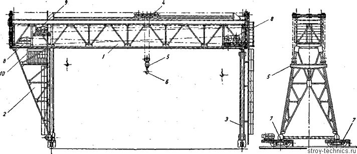 1 — мост; 2 — жесткая опора; 3 — шарнирная опора; 4 — грузовая тележка; 5 — траверса; 6 — грузовой крюк; 7 — ходовые тележки; 8 — лебедки для подъема груза; 9 — лебедка для передвижения тележки; 10 — кабина управления
