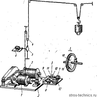 Подъемная лебедка приводится электродвигателем постоянного тока, к которому присоединен сельсин-датчик. С барабана лебедки подъемный канат направляется к тележке крана, образуя на блоках петлю. Натяжение в подъемном канате измеряется динамометром или тензодатчиком, поворотная -стрелка которого связана со вторым специальным датчиком. Для управления двигателем лебедки применяют сельсины-приемники, связанные между собой редуктором, кулачком и диском с электропереключателями. К приемнику присоединен также небольшой двигатель для автоматической установки диска в нейтральное положение.