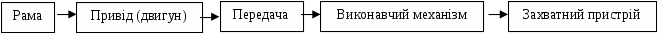 Конструктивно ПР складається з таких вузлів: основа (рама), привід (двигун), передаточні механізми, виконавчий механізм і захватні пристрої.