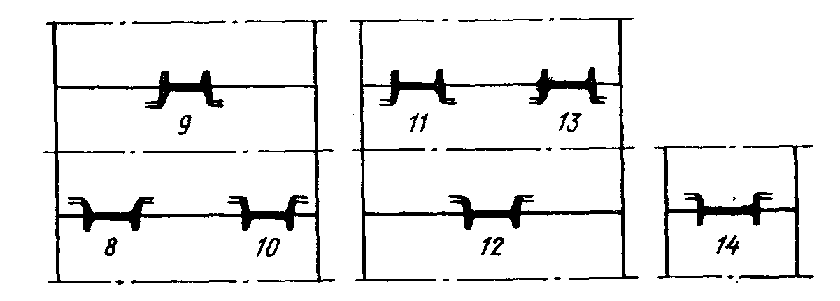 На рис. 2.2 приведены принципиальные схемы прокатки некоторых профилей, а в табл. 2.4 дана характеристика прокатных валков. Смену валков в обжимной клети осуществляют при помощи специального механизма и крана, на линии 800 заменяют целые клети. Становый пролет обслуживается пятью кранами грузоподъемностью 15, 15/13, 100/20, 50/10 и 20/5 г. На стане используют арматуру скольжения.