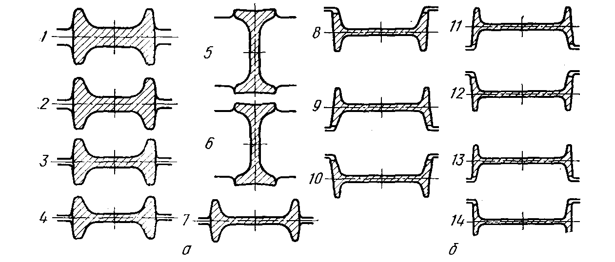 По требованию заказчика балки поставляют с уклоном наружной грани каждой полки не более 1,25%. ГОСТ 8239–72 предусматривает прокатку двутавровых балок высотой 100–700 мм (№10–70). Балки №18, 20, 22, 24, 27 и 30 имеют по два профиля. Для обозначения второго профиля рядом с номером балки ставят букву а. Указанные литерные профили отличаются от основных только увеличенной средней толщиной полок.