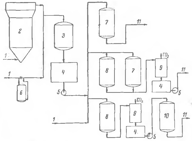 1-сырая вода; 2-осветитель; 3-механический фильтр; 4-промежуточный бак; 5-насос; 6-дозатор коагулянта; 7-Nа – катионитный фильтр; 8- Н – катионитный фильтр; 9 – декарбонизатор; 10 – ОН – анионитный фильтр; 11 – обработанная вода.