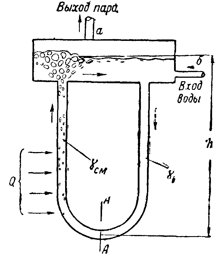 На рис. приведена схема так называемого циркуляционного контура. В сосуд наливается вода, причем левое колесо U – образной трубки подогревают, образуется пар; удельный вес смеси пара и воды будет меньше по сравнению с удельным весом в правом колене. Жидкость в подобных условиях не будет, находится в состоянии равновесия. Например, А – А давление слева будет меньше, чем справа – начинается движение, которое и носит название циркуляции. Пар выделится с зеркала испарения, удаляясь далее из сосуда, а на него место в таком же количестве по весу поступит питательная вода.
