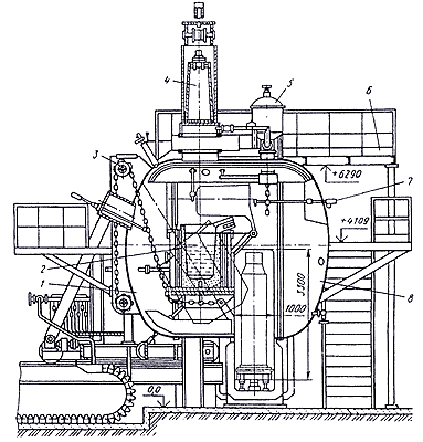 1 – подвижная и неподвижная части корпуса соответственно; 2 – тигель; 3 – механизм наклона; 4 – камера загрузки; 5 – дозатор; 6 – рабочая площадка; 7 – устройство для чистки тигля