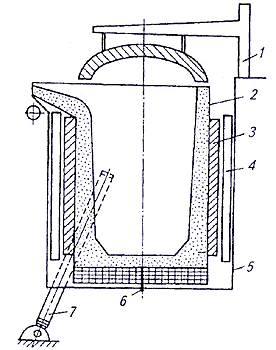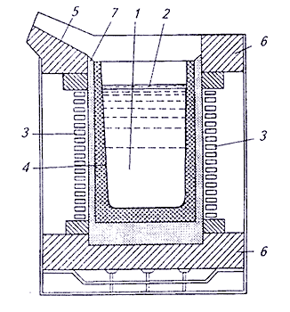 1 – жидкая сталь; 2 шлак; 3 – водоохлаждасмая катушка индуктора; 4 – огнеупорная футеровка; 5 – сливной носок; 6 – огнеупорный кирпич; 7 термоизоляция