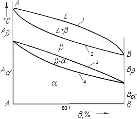 Шкала концентраций показывает содержание компонента В. Основными линиями являются линии ликвидус (1) и солидус (2), а также линии соответствующие фазовым превращениям в твердом состоянии.