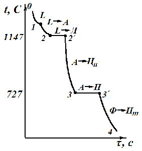вторичного цементита. Аустенит при этом обедняется углеродом и при температуре 727 °С приобретает состав, соответствующий эвтектоидному. В точке 3 начинается эвтектоидное превращение аустенита в перлит при постоянной температуре 727 °С (площадка 3–3*).