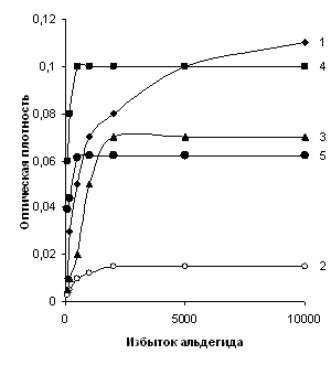 Величину избытка реагентов, достаточную для фотометрического определения, оценивали по кривым зависимости оптической плотности от соотношения альдегида – НДМГ. Было установлено, что в случае использования о нитробензальдегида достаточным является 10000-кратный избыток, для его м- и п-изомеров – 2000-кратный, для 5 фенилпентадиен-2,4-аля – 1000-кратный и для коричного альдегида – 500-кратный избыток (рис. 2).